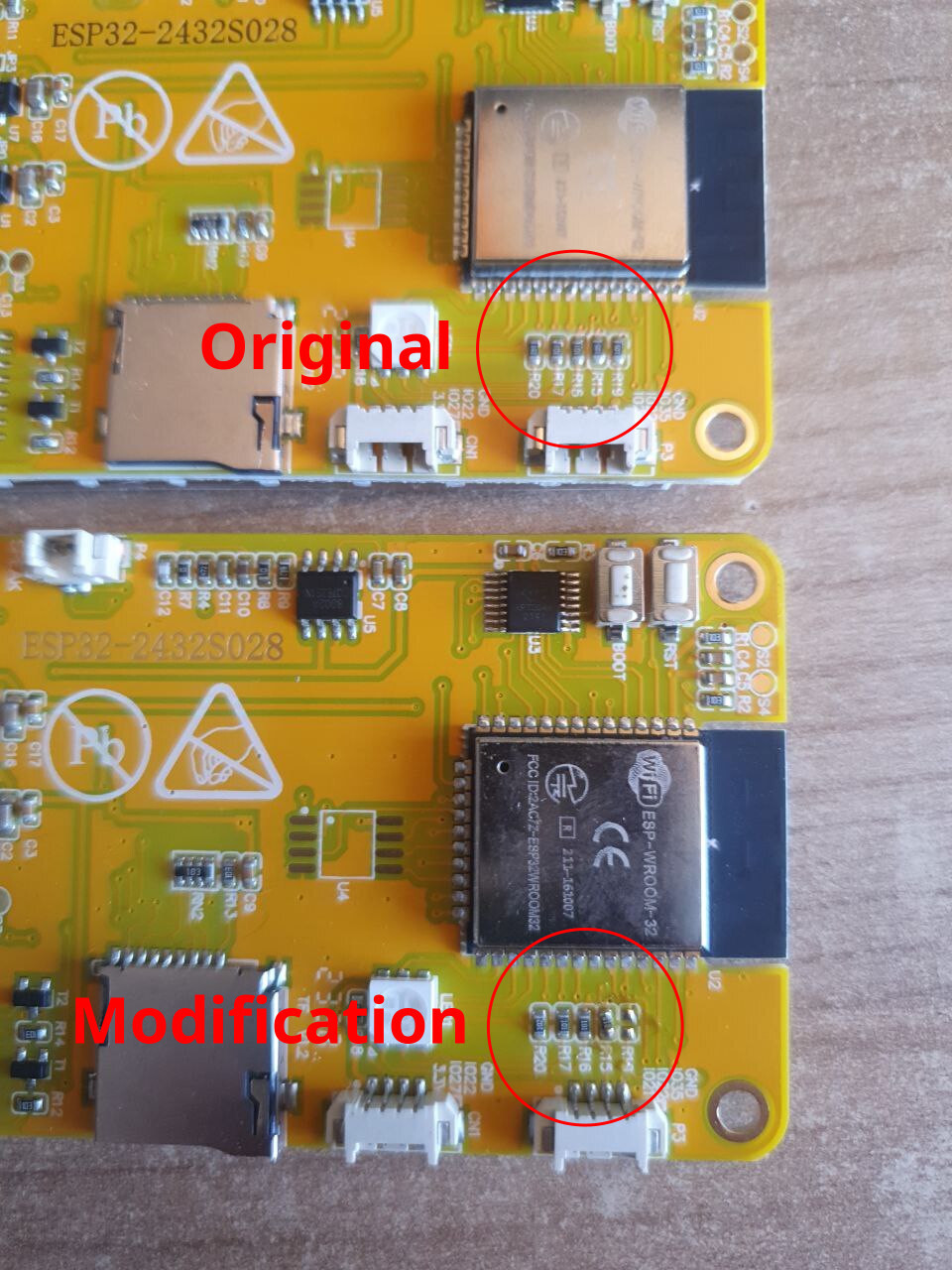 To get the LDR on the device to work properly, so the screen brightness can be adjusted to the environment lighting conditions, you need to modify the hardware a bit. I removed R19 and replaced R15 with a 100k resistor. The top board in the following image is in the original state, the bottom board has already been modified.